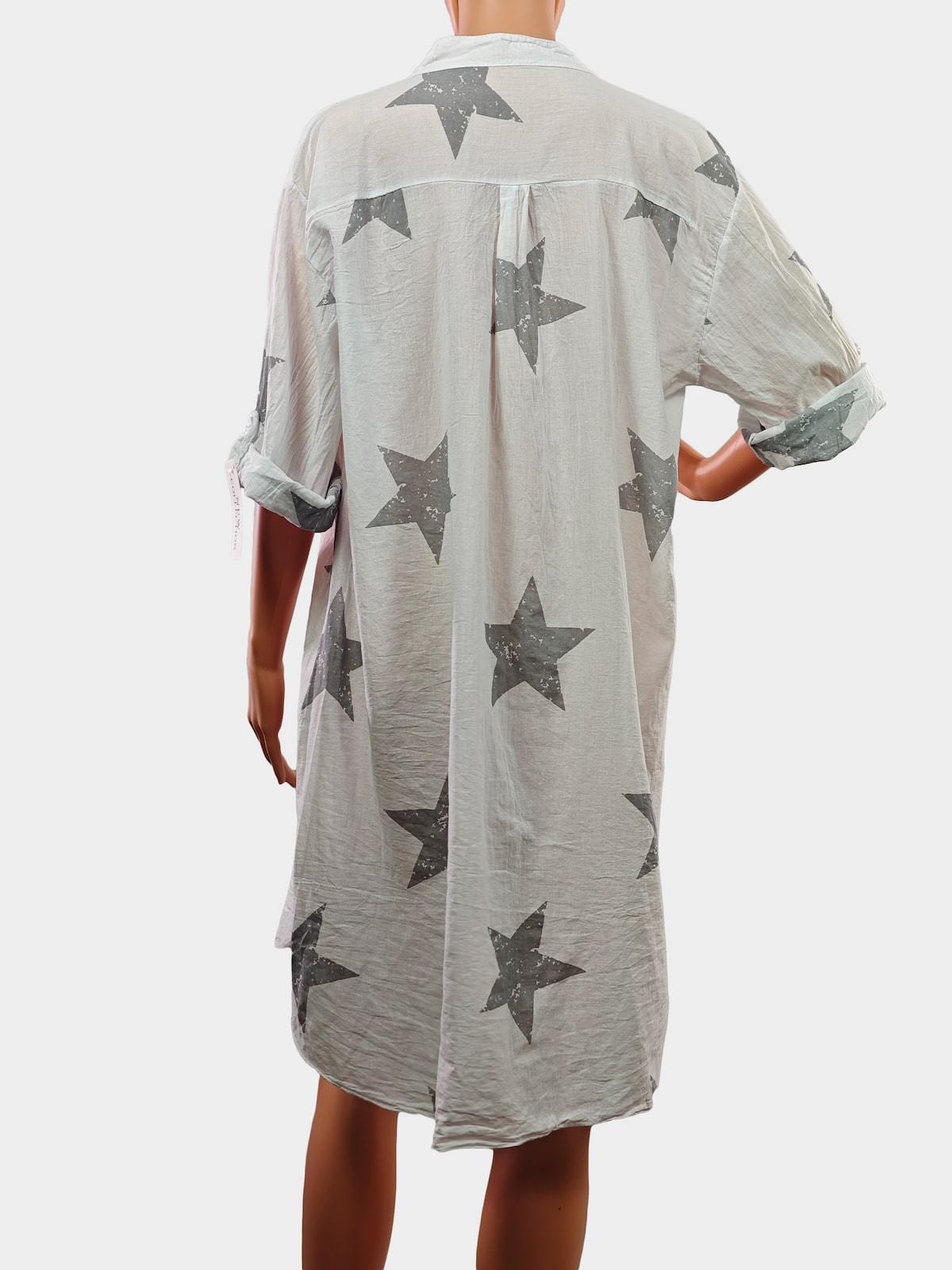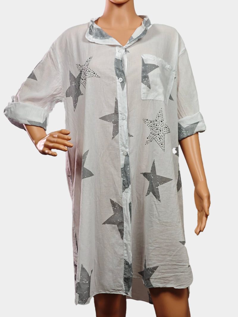 ✨ Дизайн: Модел с модерни принтове на звезди, които придават игриво настроение. Класическа яка, функционално джобче и копчета по цялата дължина.