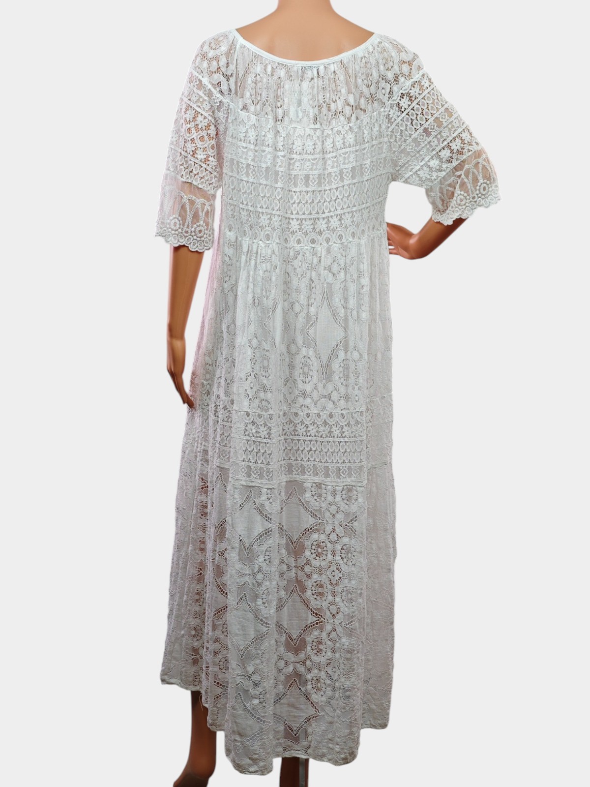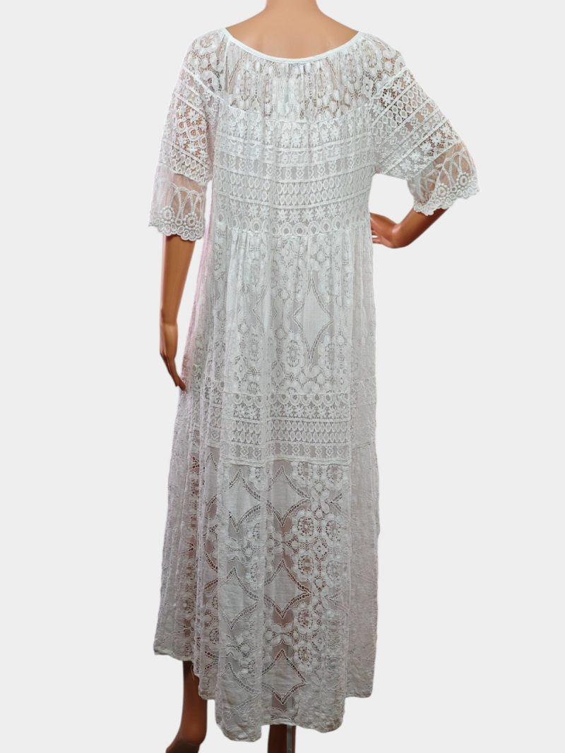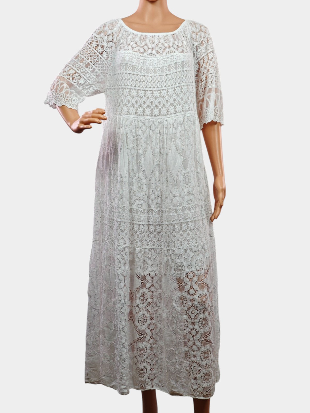 Тази дълга рокля впечатлява с изключително фино изработена дантела и деликатни флорални мотиви, които придават романтичен и изискан вид. Подходяща както за ежедневието, така и за специални поводи, тя съчетава комфорт с женственост.