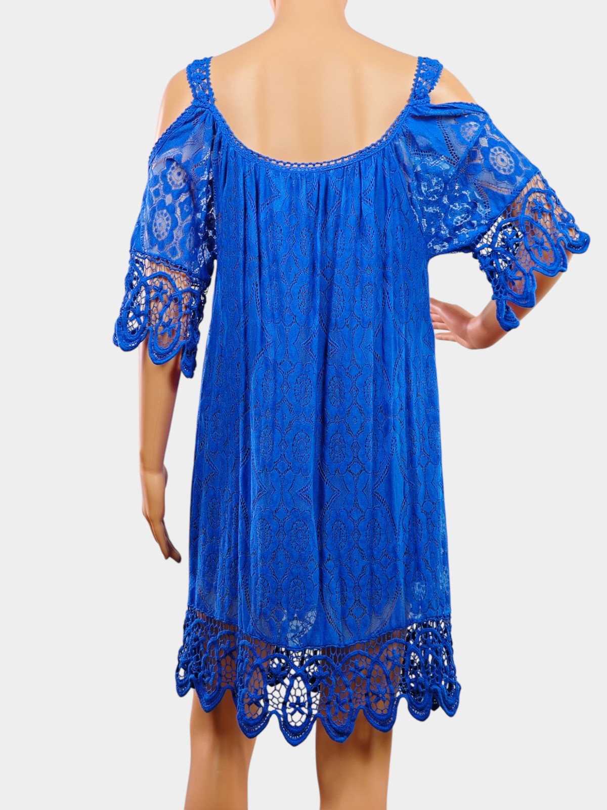 🌸 Дизайн: Красиво изрязани рамене с дантелени ръкави и долна част, които придават ефирност и деликатна елегантност. Фината плетка и декоративни мотиви създават богат, но не натрапчив визуален ефект.