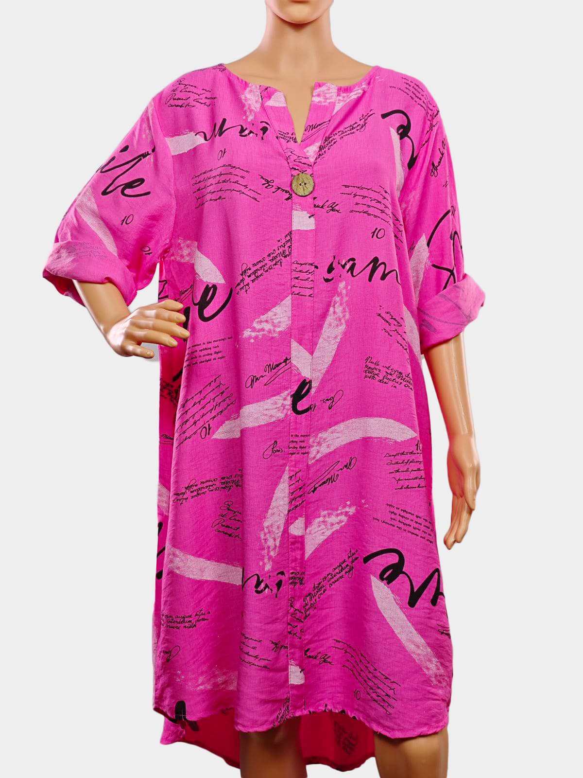 ✨ Дизайн: Абстрактен надпис и щампа в артистичен стил, които придават на дрехата характер и индивидуалност. Декоративно копче и V-образно деколте добавят завършен и женствен акцент.