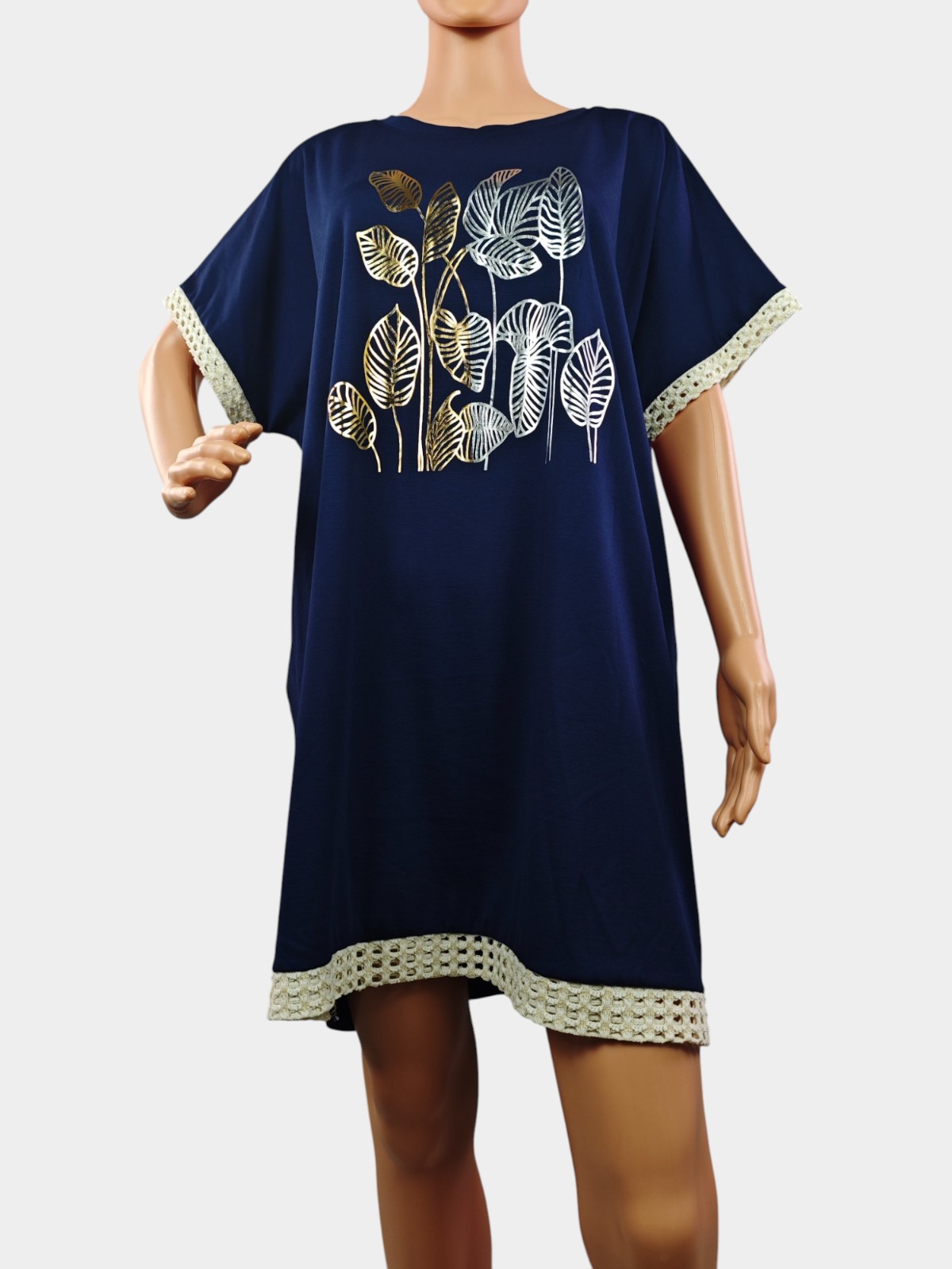 ✨ Дизайн: Централният акцент е върху декоративен принт с листа, който придава естествена свежест. Ръкавите и долната част са обградени с фина дантела, която носи лек бохемски дух и придава завършен вид.