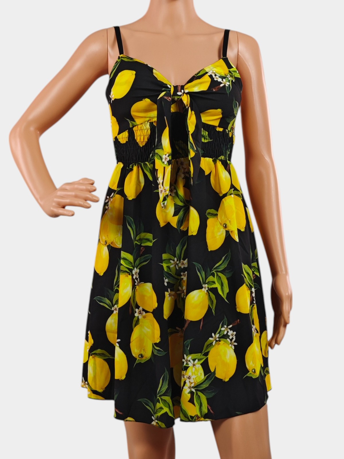 🎀 Горната част е с ефектен дизайн и връзка отпред, подчертаваща деколтето и талията.